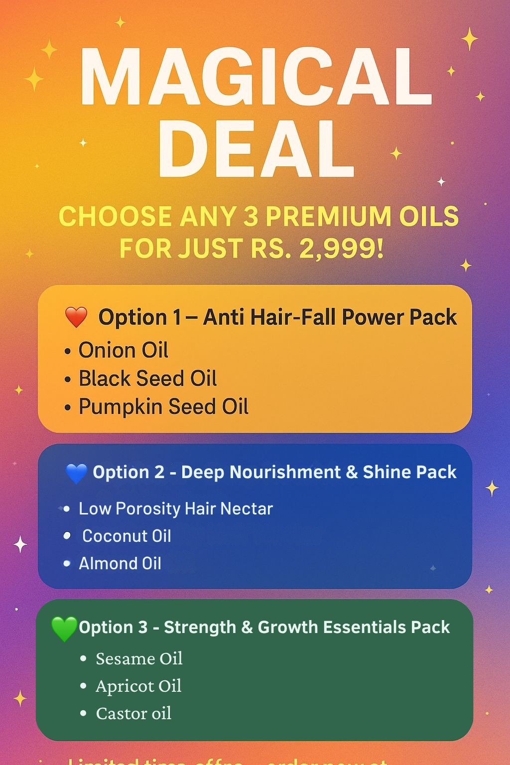 🌟 Your Hair, Your Choice! Grab any 3 premium oils at Rs. 2,999. Magical Deal live now!