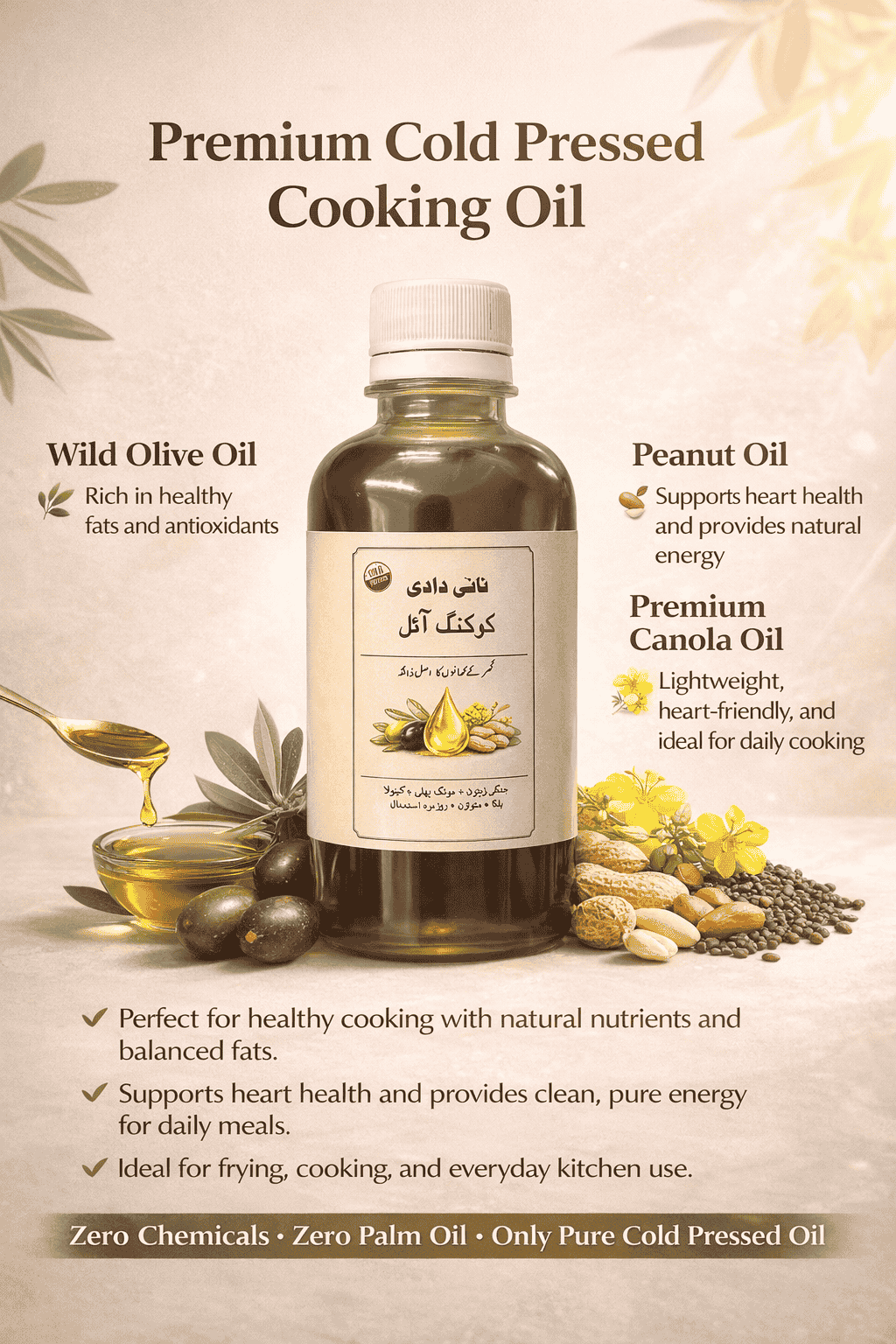 Pure, chemical-free cooking oil made from carefully selected natural sources. Cold pressed to preserve natural nutrients, flavor, and quality. Lightweight and ideal for daily cooking and frying, supporting a healthy lifestyle. Convenient 250 ml bottle, perfect for pure and healthy family meals.